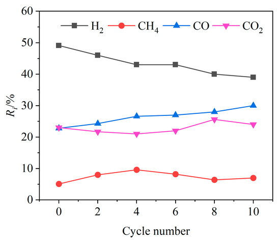 In order to investigate the cyclic stability of CSS/Fe2O3 composite OCs during the CLG of BSGs, ten redox cycle experiments were conducted at 900 °C. As shown in Figure 15, with the increase in the cycle number, the relative volume fraction Ri of H2 in the syngas showed a slow decreasing trend, while the Ri value of CO showed an increasing trend and the Ri values of CO2 and CH4 both showed no obvious variation trends. This was mainly due to the weakening of the oxygen release capacity of the CSS/Fe2O3 composite OCs as the cycle number increased. At lower cycle numbers, the oxides of calcium and magnesium in the CSSs could effectively absorb CO2, which led to a lower value in the relative volume fraction of CO2. After the cycle number exceeded four, the reaction between the oxides of alkaline earth metals and CO2 slightly weakened. This was beneficial for the Boudouard reaction, resulting in an increase in the Ri value of CO with the increase in the cycle number. After the 8th cycle, as the cycle number further increased, the Ri value of H2 in the syngas tended to be relatively stable, with the Ri value of H2 remaining at around 40%. This indicated that the CSS/Fe2O3 composite OCs had a certain cyclic stability.