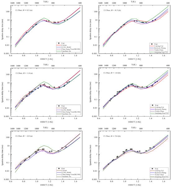 It can be seen from Figure 1 that, under the condition of 13.5 bar, Ø = 0.5/1.0/2.0, the average deviation of the Yanzhao An mechanism for the lag period is larger, and its maximum deviation can reach three times that of the other mechanisms. It can also be observed that the prediction deviation of the Liming Cai mechanism and the Junjiang Guo mechanism between 600 K and 800 K is large and that the prediction accuracy of the Curran mechanism is comparable with that of the Chun Sang Yoo mechanism. However, the prediction bias of the Curran mechanism is slightly greater than those of Mehl and Kuiwen Zhang. In contrast, the Kuiwen Zhang mechanism has the smallest prediction bias and the highest prediction accuracy.