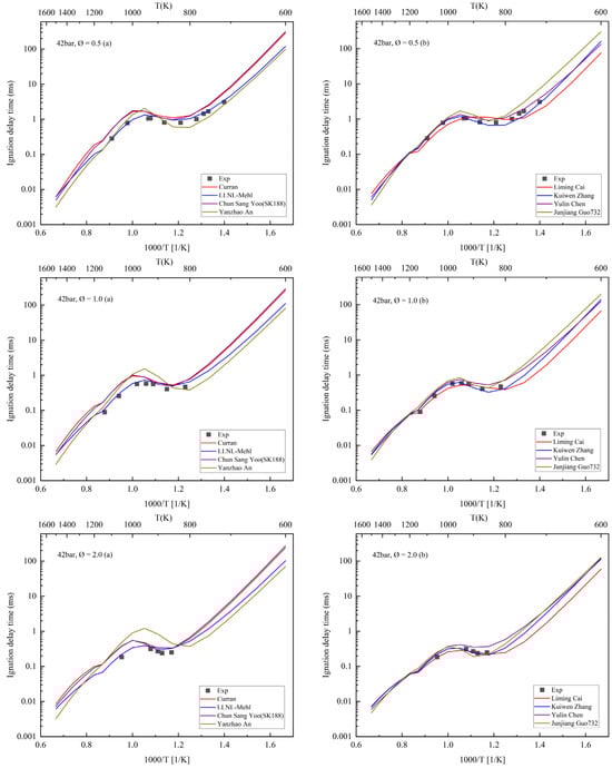 The simulation was based on the experimental environment of adiabatic premixing and had previously been performed using the homogeneous closed reactor module within CHEMKIN, employing the transient solver, with an end time of 20 s [37]. The initial temperature was 600~1500 K (a group at 50 K intervals), the pressure was 13.5 bar/42 bar, and the equivalence ratio was 0.5/1.0/2.0 [54]. From a comparison with the experimental data measured by Ciezki [54] under the same working conditions, the accuracy of the reaction mechanism was evaluated and analyzed.