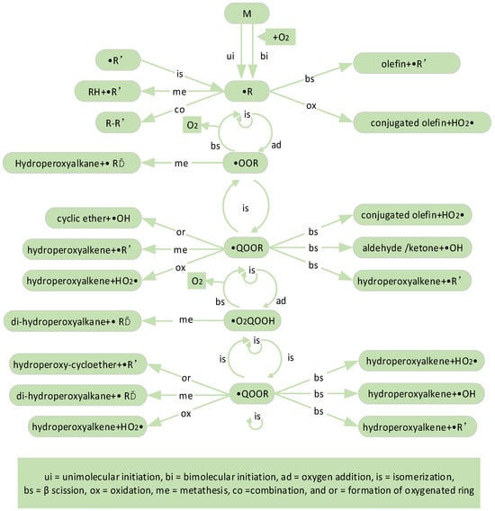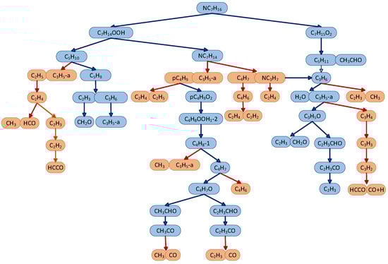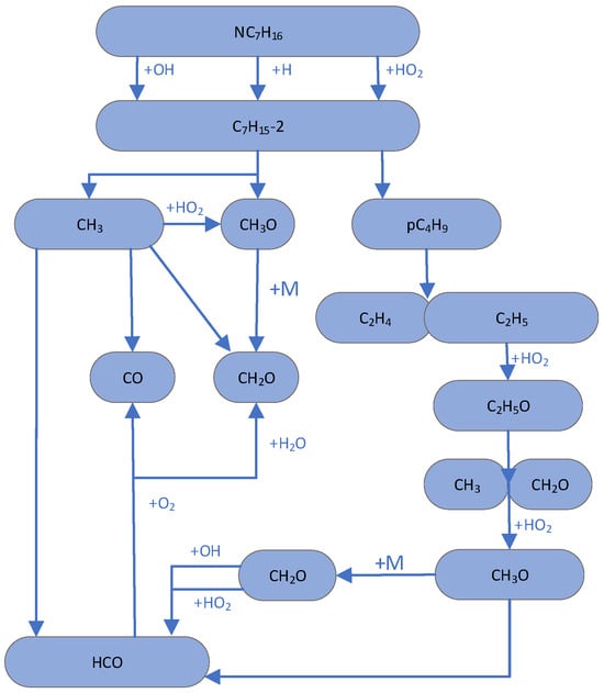 Combustion is a complex oxidation process involving a variety of chemical reactions, all of which must follow the law of conservation of mass, momentum, and energy. The formation rules for the main mechanisms [55,56] are shown in Figure 3.