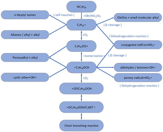 The total process of n-heptane oxidation is shown in Figure 4. The diagram summarizes the main oxidation reaction types of n-heptane at different temperature ranges from low temperature to high temperature, in which each reaction type contains elementary reactions with similar characteristics.