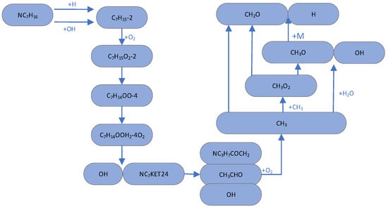 Since the 1970s, to further explore the n-heptane oxidation process, efforts have been made to establish kinetic models of n-heptane oxidation at low and high temperatures [3]. In the late 1970s and 1980s, Coats [3] and Westbrook [4,5] first modeled the oxidation of n-heptane (only high-temperature oxidation) [5].