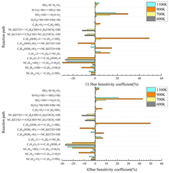 In the sensitivity analysis, the temperature is divided into four groups: 600 K, 700 K, 900 K, and 1100 K. The homogeneous reaction model was selected to simulate the retardant period under the working conditions of 13.5 bar and 42 bar. The influence of each reaction on the retardant period in the constructed chemical-reaction kinetic model was then explored, and the 15 groups of reactions that were most sensitive to the retardation period were selected [59]. The sensitivity analysis results are shown in Figure 8.