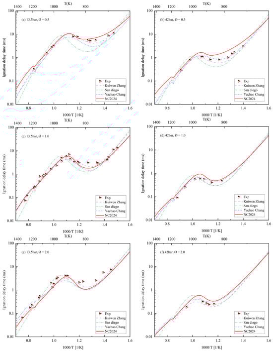 The results are shown in Figure 9. Based on the zero-dimensional homogeneous reaction model (conditions: homogeneous, adiabatic) of CHEMKIN 19.2, the simulation results of NC2024 for the ignition delay period under different working conditions were compared with the selected comparison mechanism simulation results and shock tube experimental results, as shown in Figure 9.