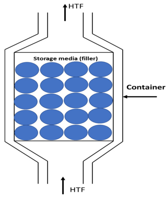 As illustrated in Figure 1, the PBSS system has three main components: a storage vessel (container), storage media (filler), and heat transfer fluid (HTF). The storage vessel is filled with solid packing material known as the “filler”. These solid particles receive energy through an HTF, which may also function as the working fluid within the system that incorporates the packed bed. Various packed-bed designs can be found in numerous publications [7,8,9,10], showcasing differences in shape, the materials used for storage, and the HTF employed.