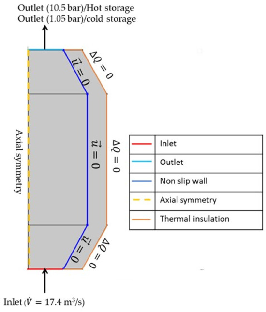 The boundary conditions set included a no-slip wall where the velocity was zero at the solid surfaces (. At the inlet, a condition of fully developed flow was established with a constant volume flow rate ( m3/s), while a pressure condition was applied at the outlet to avoid backflow. Adiabatic boundary conditions were used at the outer boundary of the insulating material (). The simulation examines incompressible fluid flow with operational pressures of 10.5 bar for the hot-storage reservoir and 1.05 bar for the cold-storage reservoir. The boundary conditions are shown in Figure 3.