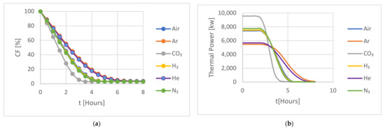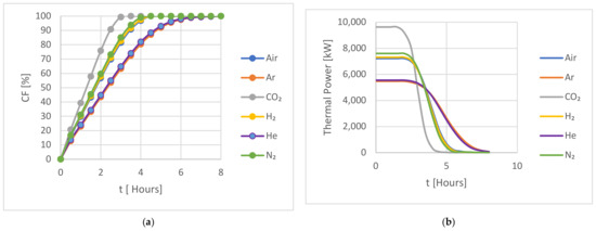 The performance of the investigated HTFs was evaluated for a charging cycle over eight hours. The results are presented below. Figure 4 shows a comparison of the capacity CF and the thermal power of the studied gases for hot storage during the 8 h charging period.