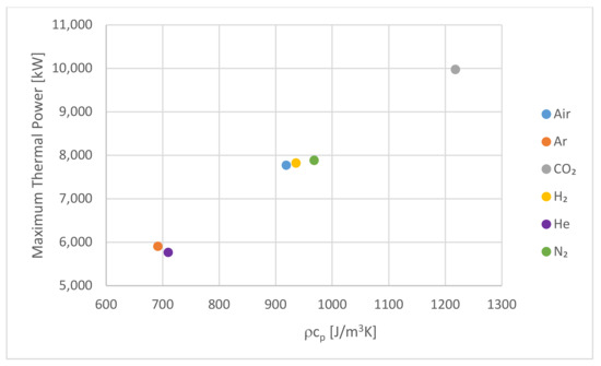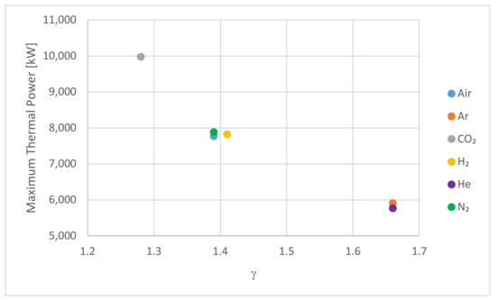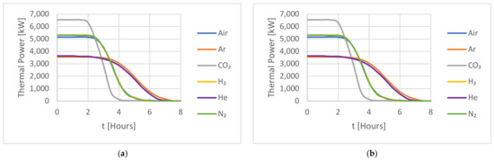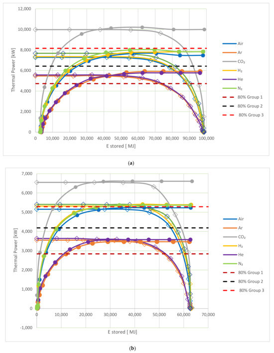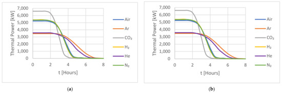 The same grouping can be seen in Figure 5b, where the thermal power for CO2 is initially higher than the other gases before reducing as the hot storage approaches full capacity. The group 2 HTFs all behaved similarly to each other, had a lower initial thermal power, and took longer to reach their full capacity. The initial thermal power of the group 1 gases was still lower, and both gases took longer to fully change the system.
