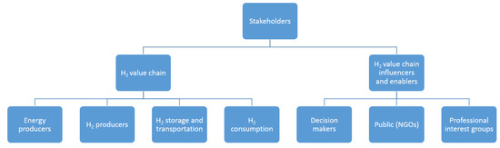 In the case of the present work, stakeholders were identified based on stakeholder lists from Durham et al. [30,31,32] and complemented by inputs from various researchers in the field. Gunnarsdottir [38] offers a comprehensive list of stakeholders in the Icelandic energy sector. The energy sector is closely linked to the hydrogen economy as hydrogen is supposed to form a major pillar of the energy system by becoming a widely used energy carrier [39]. Consequently, the list of stakeholders in the energy sector formed a good basis for a stakeholder assessment of the green hydrogen economy. A generic stakeholder map provided by Gunnarsdottir et al. [37] served as the basis for developing a stakeholder map of the green hydrogen economy in Iceland. This stakeholder map was used to assist us in compiling a comprehensive stakeholder list, shown in Figure 1. The stakeholder list from Perruchoud et al. [40] was a valuable resource for adding additional stakeholders specifically associated with the hydrogen economy in Iceland. The combined stakeholder list was reviewed by experts whose input aided us in finalizing the stakeholder list used for this study.