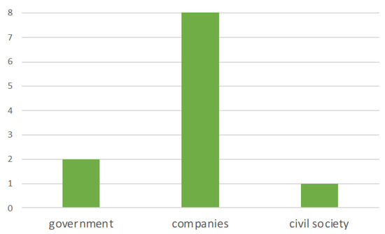 For the data collection, 11 stakeholder interviews were conducted during 2022–2023. The interviewees represented organizations from all societal sectors, as shown in Figure 2. However, most of the interviewed stakeholders were associated with companies—the industrial sector was dominant over the other two societal sectors in terms of the number of conducted interviews. However, within the industry sector there was significant variation in terms of the position in the value chain of each company, as shown in Table 2, which added to the heterogeneity of the interviewee sample. In addition, the aim of such a qualitative enquiry is typically to reveal interesting perspectives and opinions or underlying reasons and factors, not to reach full coverage of all the possible perspectives and attitudes or to allow for broad generalizations [41]. We will return to the interviewee sample issue in the Section 5.