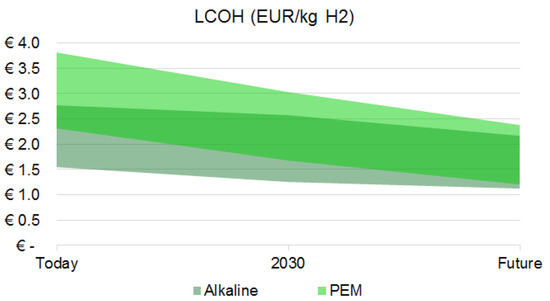 Kuckshinrichs et al. [27] conducted an economic analysis of hydrogen production with an alkaline water electrolyzer at three different site locations in Europe (Germany, Austria, and Spain). They reported that the levelized cost of hydrogen (LCOH) was around 3.64 EUR/kg H2 in Germany, whereas in Austria and Spain, it was estimated to be slightly higher (15 to 18%) due to higher electricity costs. Matute et al. [28] also assessed the cost of green H2 production in Spain to be around 6 EUR/kg H2 for an alkaline electrolyzer and about 7 EUR/kg H2 for a PEM electrolyzer.