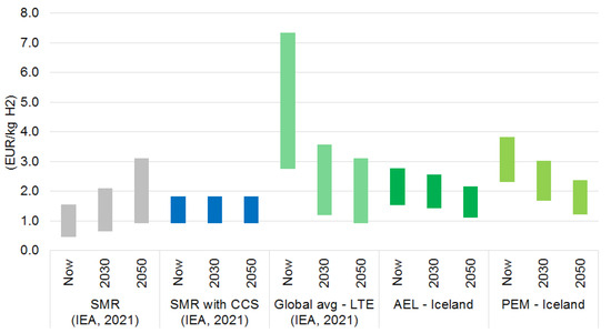 Figure 5 compares the levelized cost of green hydrogen production in Iceland with the global average and that of other technologies (the Steam Methane Reforming (SMR) of natural gas with and without carbon capture and storage (CCS), obtained from a recent IEA report [11].