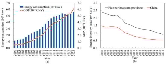 The northwest China region is in the middle or near late stage of industrialization and needs to rely on large amounts of fossil energy consumption to drive economic development [,]. As shown in Figure 2a, the GDP of the five northwestern provinces of China has increased with energy consumption, which rose from 1.14 × 108 tons of standard coal equivalent (tce) in 2000 to 5.56 × 108 tce in 2021. The GDP of the region also grew from 0.48 × 1012 CNY in 2000 to 6.08 × 1012 CNY in 2021. As shown in Figure 2b, energy intensity in the five northwestern provinces is above the domestic average, which means that the decrease in energy intensity in the northwest has also contributed to the improvement of domestic energy efficiency. Therefore, to reduce the energy intensity in Northwest China and the continuous improvement of energy use efficiency at the nationwide level, it is urgent to analyze the energy intensity of Northwest China.