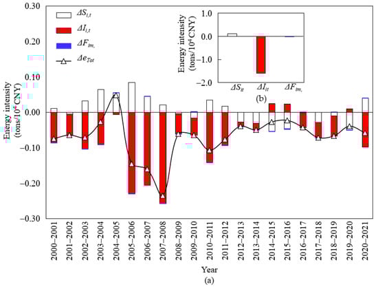 The LMDI decomposition results of energy intensity in Northwestern China are shown in Figure 4. There was an overall decrease in energy intensity except during 2004–2005 (Figure 4a).