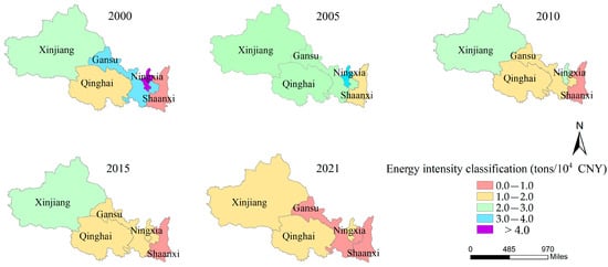 First, the total energy intensity of the five northwestern provinces decreased from 2.389 tons/104 CNY in 2000 to 0.916 tons/104 CNY in 2021, with a decrease of 61.6%. Among the five provinces, the decrease rates in energy intensity, from largest to smallest, were in Gansu, Ningxia, Qinghai, Shaanxi, and Xinjiang.
