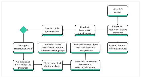 To effectively assess farmers’ attitudes toward renewable energy methodologies such as the Best–Worst Scaling method can be employed. This method can determine which features of renewable energy farmers find most appealing and which they find least attractive. Furthermore, detailed information on farmers’ objectives and concerns can be obtained by asking them to rank the best and worst options for renewable energy based on various statements or features, such as equipment price, convenience, or environmental impact. This method assists in determining how farmers view the possible advantages and difficulties of incorporating renewable energy into their farming operations. The more detailed process that led the authors to choose this method is presented in Figure 1.