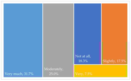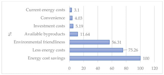 In terms of preferences for using byproducts for energy purposes, there are a range of perspectives, showing that 31.7% of farmers have a significant preference for this practice, as a group that also wants to lower the leftovers in farms and contribute to sustainability in terms of energy, as shown in Figure 4. A positive response came from 64.2% of the farmers, who rated “very much”, “very”, and “moderately”, showing a great trend toward energy efficiency, cost reductions, and environmental impact. However, a little scepticism was found, as 18.3% of the respondents showed hesitancy and concern regarding the practicality of using and underestimating the value of byproducts (straw and stalks). A study elaborated on the barriers that affect farmers’ biomass cultivation for energy purposes [62]. Two categories of factors influence farmers’ willingness to start or expand biomass production for bioenergy: situational (such as market conditions, infrastructure, environmental conditions, institutional frameworks, and legal settings) and personal (such as attitudes, values, habits, and needs).