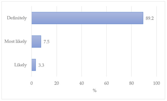 Moreover, there is strong knowledge and opinion regarding the notion that clean energy can improve quality of life compared to traditional sources. This is documented by the 100% positive opinions from the respondents, of which 89.2% mentioned that clean energy “definitely” improves quality of life, leading to environmental advantages and health prosperity (Figure 5). Only 10.8% of the respondents had a little reservation with regard to this factor; 7.5% chose “most likely”, whereas 3.3% chose “likely”, showing little uncertainty in the benefits of clean energy compared to traditional sources. Participants support cleaner energy practices and see this transition as being necessary for a more sustainable and economically stable future. The adoption of renewable energy solutions by farmers is significantly influenced by both environmental regulation and value perception. Government mandates, incentives, and environmental restrictions establish a framework that encourages farms to transition to more sustainable energy techniques. To meet environmental requirements and stay out of trouble, farmers are frequently pushed toward cleaner choices by these rules, which include financial incentives or penalties [63]. However, farmers’ decisions are also influenced by their perception of value. Farmers are more inclined to adopt sustainable energy technologies as they become aware of the long-term advantages, such as lower energy costs and improved environmental stewardship. Farmers are more likely to incorporate renewable energy into their business if they believe it will be a profitable and environmentally beneficial investment. The combination of regulatory pressure and a favourable change in the perception of clean energy significantly increases farmers’ adoption.