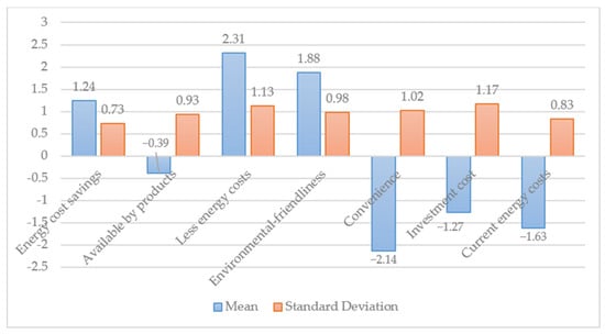 The primary data analysis stage is determining the Best–Worst Scaling (BWS) values. The authors determined the difference between each feature’s “most important” and “least important” elements to accomplish this. This technique allowed the authors to examine how each attribute was regarded compared to the others. The study discovered that four of the seven qualities obtained good ratings, with only three having negative BWS levels. These four features were consistently rated as “most important” by participants, emphasizing their relative importance in comparison to the other attributes. In the second phase of the analysis, the BWS values were normalized to account for the sample size (120 participants) and the frequency with which each attribute featured in the experimental design. The authors calculated standardized BWS values by dividing the BWS values by the number of participants and the frequency with which each attribute was presented. These standardized values were then ranked to provide a more accurate view of the relative relevance of each element. This ranking process enabled the identification of the most to least significant elements based on farmers’ perceptions. In the third phase of the analysis, the Best Ratio Scale was created by taking the square root of the ratio between the “most important” and “least important” cumulative data, √ . This step standardized the data, allowing for more accurate comparisons across the various properties. The attribute that received the highest score based on this formula was “Less energy costs”, which had the highest cumulative value of 100%. As a result, it was placed at the top of the scale. All other attributes were then measured relative to it. This approach allowed identifying which attributes were perceived as more or less important when considered in the context of the most highly ranked factor.
