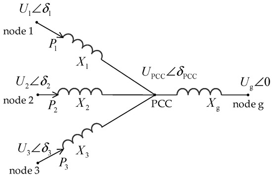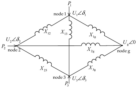 P 1 = U 1 U 2 X 12 sin δ 1 δ 2 + U 1 U 3 X 13 sin δ 1 δ 3 + U 1 U g X 1 g sin δ 1 P 2 = U 1 U 2 X 12 sin δ 2 δ 1 + U 2 U 3 X 23 sin δ 2 δ 3 + U 2 U g X 2 g sin δ 2 P 3 = U 1 U 3 X 13 sin δ 3 δ 1 + U 2 U 3 X 23 sin δ 3 δ 2 + U 3 U g X 3 g sin δ 3