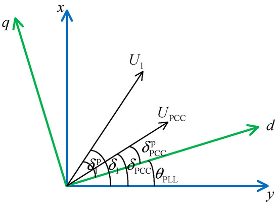 The wind farm is connected to the point of common coupling (PCC) through a phase-locked loop (PLL). For the studied wind farm, there are two reference frames, i.e., the xy-frame and the dq-frame, as shown in Figure 4. The xy-frame coincides with the Ug, while the dq-frame is defined by the PLL. When a disturbance occurs in the system, under the action of the PLL, an angle difference, θPLL, is generated between the two coordinate systems. The superscript ‘p’ indicates variables in the dq coordinate system.
