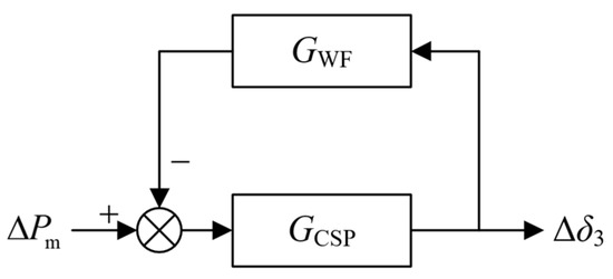 From the above analysis, increasing the damping coefficient D of the CSP plant can mitigate the sub-synchronous oscillation. Therefore, to enhance the stability of the hybrid system, the most effective method is to increase the damping coefficient D of the CSP plant. However, for an already established CSP plant, its damping coefficient D is fixed, so it is necessary to introduce a damping controller to increase the equivalent damping of the CSP. To do so, a damping controller, as shown in Figure 16, is designed. Its input is the rotor speed, i.e., ω3, of the CSP generator, and its output is the additional damping reference power, which is used to guide the prime mover output power in the CSP plant.