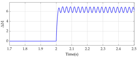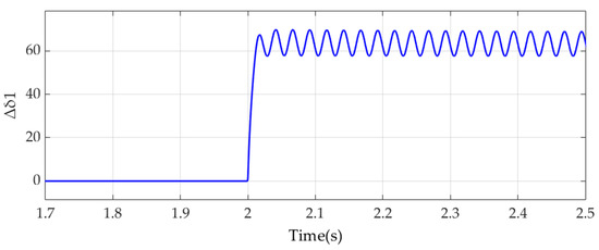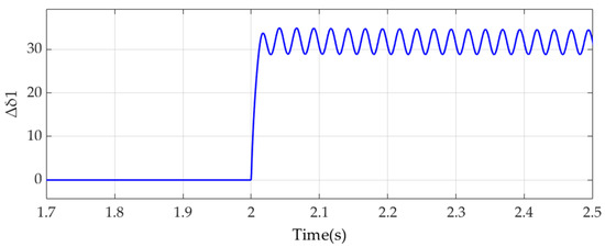 To further validate the above findings, we conducted a time-domain simulation in Matlab/Simulink (Version R2022b). At 2 s, the sudden increase in the output power of the wind turbine was set to 1%, 5%, and 10%, and the time-domain simulation results are shown in Figure 8, Figure 9 and Figure 10, respectively. It can be observed that the magnitudes of the power angle oscillations for the wind turbine are 1.227°, 6.135°, and 12.27°, with an oscillation frequency of 39.7 Hz in all cases, indicating sub-synchronous oscillations.