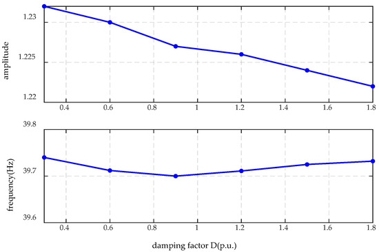 To effectively suppress the sub-synchronous oscillation in the hybrid system, it is necessary to first study the impacts of various parameters of the CSP plant and wind farm on the oscillation amplitude and frequency. Figure 11 and Figure 12 illustrate the effects of the rotor inertia constant M and damping coefficient D of the CSP generator on the sub-synchronous oscillation. It can be observed that as the rotor inertia constant M increases, the oscillation amplitude becomes larger, and the oscillation frequency decreases. Moreover, when the damping coefficient D increases, the oscillation amplitude slightly decreases, but the impact on the oscillation frequency is negligible.