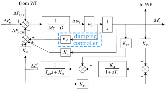 Δ P 3 , C S P = K 9 Δ δ 3 + K 10 Δ E q Δ E q = K 11 Δ E q + K 12 Δ δ 3 Δ U 3 = K 13 Δ δ 3 + K 14 Δ E q