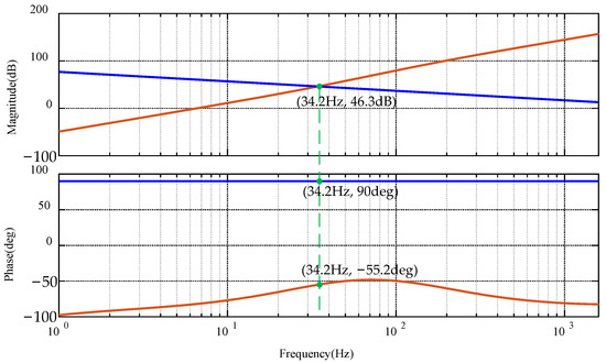 Figure 7. Bode plot of the hybrid system. (The orange line represents 1/GCSP, and the blue line denotes GWF.)