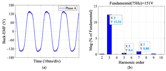 Phase-A back-EMF of the prototype DTP-PMSM and its FFT result at 1500 r/min: (a) Back-EMF. (b) FFT result of Phase-A back-EMF.