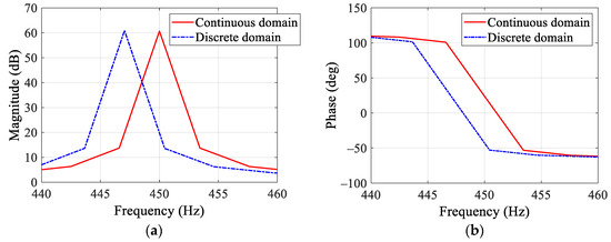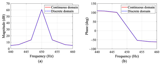 Comparison of the continuous and discretized amplitude– and phase–frequency characteristics of the improved PIR term with discretization correction: (a) Amplitude–frequency characteristics. (b) Phase–frequency characteristics.