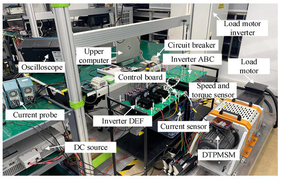 A prototype platform for the DTP-PMSM drive system was constructed to validate the proposed harmonic suppression strategy. The platform consists of a DTP-PMSM prototype, a control board, two IGBT-based three-phase inverters, a current sampling board, and a speed-torque sensor, as shown in Figure 9. The control board employs a DSP control chip from Texas Instruments (model: TMS320F28335). The IGBT switching frequency is set to 10 kHz, matching the current loop control frequency. The dead time is configured to 500 ns. The PWM signals generated by the control board are routed through a driver circuit to produce the drive signals for the three-phase inverters. The load is provided by a variable-frequency drive that controls a three-phase asynchronous motor. The current sampling board uses six current sensors from LEM (model: LA25-NP) to measure phase currents. Additionally, a speed-torque sensor is included to measure speed and torque. The parameters of the dual three-phase motor prototype are listed in Table 1.