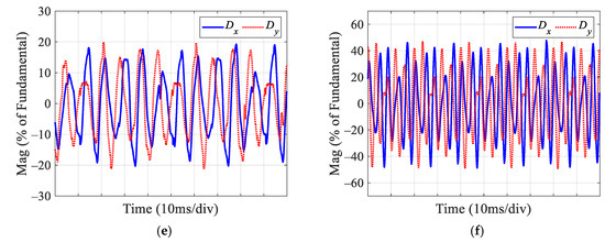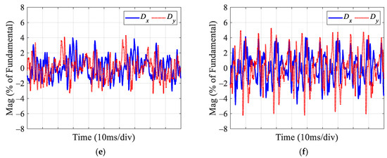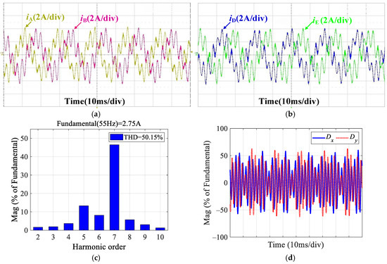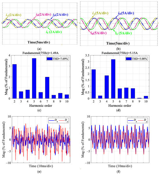 To further verify the effectiveness of the proposed dual improved PIR controller under different loads, Figure 15 presents the experimental results with the proposed method at a speed of 1500 r/min under light load (4 N·m) and heavy load (14 N·m) conditions. By comparing Figure 15a–d with Figure 13c,f, it can be seen that, at the same speed, the THD of the phase current decreases as the load increases. Under light load conditions, the THD of the current is higher. This is because the duty cycle is lower, and the effect of the inverter dead time on the phase current is more pronounced, leading to a larger harmonic voltage and higher THD. Additionally, the relatively larger speed fluctuations at light load also result in greater harmonics and higher THD. By comparing Figure 15e,f with Figure 14c, it can be observed that Dx and Dy are very small under different load conditions. According to these experimental results under various load conditions, it is evident that the improved PIR controller also maintains good robustness to load changes.