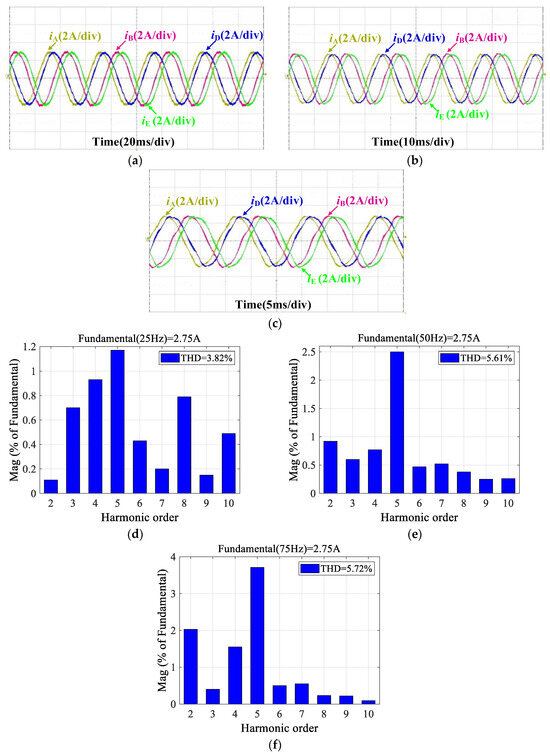 Experimental results based on dual improved PIR controllers for xy-plane current under different speeds: (a) Phase current waveforms at 500 r/min. (b) Phase current waveforms at 1000 r/min. (c) Phase current waveforms at 1500 r/min. (d) FFT result of phase A current at 500 r/min. (e) FFT result of phase A current at 1000 r/min. (f) FFT result of phase A current at 1500 r/min.