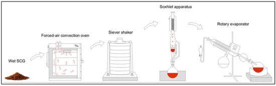 Coffee is one of the most widely consumed and popular beverages globally. According to data from the International Coffee Organization [1], global consumption of green coffee beans exceeded 10 million tons between 2019 and 2020 each year. Atelge et al. [2] projected that coffee consumption could reach 12.24 million tons by 2030 considering a linear regression. There are eight main coffee producers in the world, with Brazil alone producing more than 62,000 thousand bags in 2022/2023, 3.75 million tons, followed by Vietnam and Colombia [3]. About half of the coffee beans that are processed end up as waste in the form of SCG. Globally, the production of coffee results in approximately 6 million tons of SCG annually [4]. Although this waste contains 12–16% d.b. of oil, which can be reclaimed and utilized in various ways, including their conversion into biodiesel, currently most of it is discarded in landfills [5]. Recently, there has been growing interest in utilizing spent coffee grounds as a promising source for biodiesel production, primarily because of their significant oil content [6] and their high calorific value of about 5950.2 kcal/kg (dry weight) [7]. However, there are some critical factors in the viability of its reuse, such as the high humidity of the spent coffee grounds, collection and transportation of the SCG to the oil extraction plant.