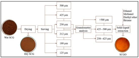As shown in Figure 2, particle size distribution was evaluated in a vertical vibratory sieve shaker Tyler series system, with the method presented by Gomide [34], where the milled material retained in each sieve was: mesh 32, 35, 60, 65, 80 and mesh 115. SCG with a wide size distribution was sieved, and the particles of different size ranges were weighed using an electronic balance. Additionally, based on the quantity of material held in each sieve and the overall average particle diameter, three different sample sizes were assessed: passing material at mesh 32 and retained at mesh 32 and 35 which corresponds to an average size of 604, 463, and 338 µm, respectively. This decision to select sample sizes for the laboratory-scale extractions is justified by the distribution of particle sizes obtained.