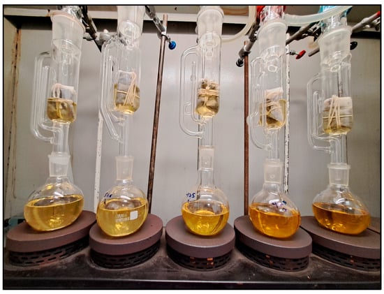 Another parameter that influences the extraction process is the extraction time, which can enhance both yield and composition through increased diffusion, but directly impacts energy expenditure [30]. Zhao and Zhang [31] compared the effect of time extraction on supercritical CO2 extraction with SE and showed a significant and rapid increase in oil yield as the extraction time extended, but this effect was most pronounced up to a duration of 2 h. Alara et al. [32] extracted phenolic compounds from Vernonia cinerea using a Soxhlet apparatus, with extraction durations of 1, 2, 3, and 4 h. The highest extraction yields were observed after 2 h of extraction, with diminishing returns thereafter. This decrease in yield was due to the degradation of phenolic compounds resulting from extended heating of the plant samples. Extraction procedures may affect quality by degrading thermolabile compounds in the extracts [11] and modifying the physical-chemical parameters of the oil, impacting the quality of the biodiesel. Spent coffee grounds oil (SCGO) with a high FFA content reduces biodiesel generation during the transesterification process because it will cause saponification during the transesterification reaction and reduce the yield and quality of biodiesel [33].