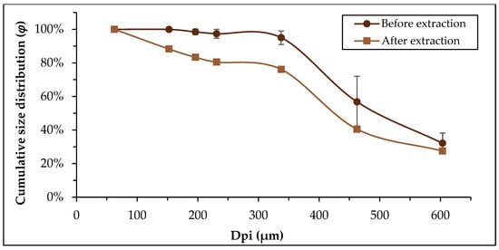 The cumulative particle size distribution profiles of the SCG before and after extraction are shown in Figure 4. Every material fraction retained in each sieve after the sieving process resulted in a particle size distribution. The weight fractions of SCG before extraction retained on each sieve were: 604 µm (32.15 ± 6.02%), 463 µm (24.63 ± 10.74%), 338 µm (38.26 ± 11.26%), 231 µm (2.33 ± 1.35%), 196 µm (1.10 ± 0.97%), 153 µm (1.47 ± 0.16%), and 63 µm (0.07 ± 0.01%). This distribution represents an average particle size of 411.31 ± 2.75 µm and most of the material amount is above the mesh 60 (250 µm), almost 90.49%. Although smaller particle-size sieves were not used, the results indicate greater accumulation on the 338 µm sieve. The largest portion of SCG particles is smaller than 1 mm, consistent with the results presented in the literature [42].