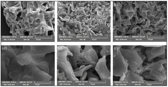 As shown in Figure 5a, there was a lot of oil in the SCG grain. In addition to its heat value, the SCG has a unique microporous structure and a high surface area [43]. After extraction with the solvents, the cell walls were greatly ruptured, and the oil was completely extracted (Figure 5b,c). After extraction, SCG had an irregular shape and rough surface. Figure 5b,e show the ethanol extraction, and it is clear to observe that the cells are smaller and have more ruptures than diethyl ether extraction (Figure 5c,f). The images show that the polar solvent was able to reduce the material inside the cells even further, resulting in a better extraction yield.
