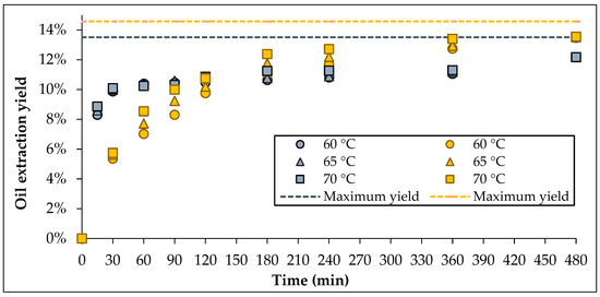 The type of solvent used, however, had a greater impact on the amount of oil produced in a specific period; for the experiment with hexane, it was necessary to increase an extraction point in a time of 15 min. For this solvent, the oil was extracted faster than with ethanol in the first minutes. In the first 90 min, hexane produced far more oil than ethanol for all examined temperatures. However, in the same extraction period (480 min), ethanol had a higher SCGO yield. The yield of oil extracted by ethanol in 8 h was 13.46 ± 0.75%, while hexane obtained 12.17 ± 1.73%, Compared to hexane, ethanol results in higher yields. Considering that ethanol has polar properties, the highest yield may be due to the coextraction of polar components other than lipids in SCG [49].