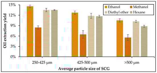 Extraction yields for different solvents and particle sizes ranges of SCG.