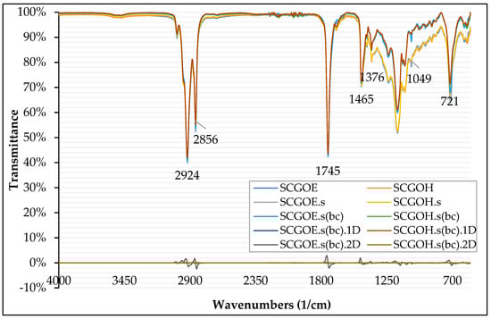 The oil extraction yield was influenced by the properties of the solvents used. The spectra of SCGO extracted using ethanol and hexane were analyzed through FTIR. In oils and fats, numerous bands within the spectrum correspond to specific functional groups. Triglycerides, as the predominant components in these materials, largely define the spectral profile [51]. Figure 8 shows the smoothed (s), corrected and normalized (bc) spectra obtained in transmittance in the region from 4000 to 550 cm−1.