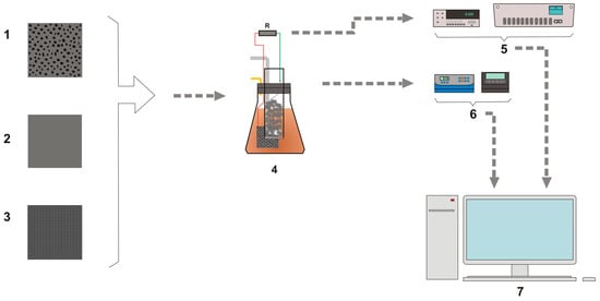 26]. The MFCs were periodically supplied with diluted MDYP. When nutrient levels dropped, as indicated by a decrease in cell voltage, the depleted MDYP was replaced with fresh MDYP, initiating another start-up phase. This procedure was repeated until the cell voltage stabilized, signifying that a consistent biofilm of EAB adapted to EET had developed. At this point, the electrode was considered fully functional. Throughout the start-up process, both cell voltage and COD reduction were tracked. COD concentrations were recorded before and after each start-up cycle. Once the electrode had developed a stable biofilm, measurements of cell voltage, power density, and current density were conducted. COD levels were also measured before and after each new feeding of the MFC. The electrical parameters of the MFC were measured using a PGSTAT302N potentiostat (Metrohm-Autolab BV, Utrecht, The Netherlands) and a Fluke 8840A multimeter (Fluke Corporation, Everett, WA, USA). COD reduction was assessed with a Hanna HI 83224 photometer designed for wastewater treatment (HANNA Instruments, Woonsocket, RI, USA).