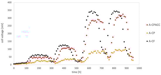 During the initial phase, the cell voltage was monitored throughout the MFC start-up process. These start-up procedures were conducted for three different anode types analyzed in this study (A-CPACC, A-CP, and A-CF). The measured cell voltage values were compared to the baseline voltage of the MFC running without microorganisms (with electrodes containing diluted MDYP).