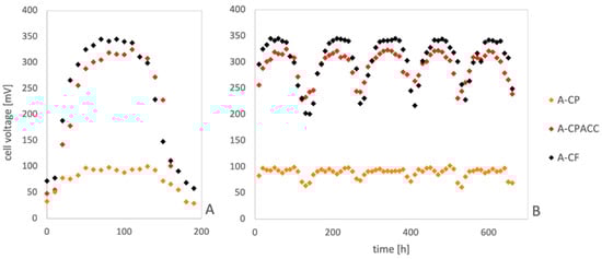 Figure 3B), the biofilm was replenished every 110 h, with the feeding intervals adjusted according to the electrode used. The instability of MFC operation (fluctuations in cell voltage) results from the cyclic power supply used in this study. For practical applications, the cell would need to be powered continuously, for example, by ensuring a constant circulation of the supplied substrates.