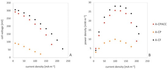For the A-CPACC and A-CF anodes, the power density achieved was comparable, ranging from 10 to 28 mW·m−2. However, it is worth noting that the A-CP electrode demonstrated the lowest performance, with a power density of 10 mW·m−2. In contrast, the A-CF and A-CPACC electrodes produced very similar results, with power densities of 26 mW·m−2 and 28 mW·m−2, respectively. Notably, the power density for the A-CPACC electrode consistently remained high across the entire range of current densities, like for the A-CF electrode. In contrast, the power density for the A-CP electrode was consistently the lowest over the entire measurement range.