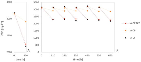 Figure 5A), the A-CF electrode system achieved the highest COD reduction efficiency at 31.4%. The A-CPACC system followed with a 29.4% efficiency, while the A-CP system reached 7.5%. The comparable COD reduction percentages for the A-CF and A-CPACC systems can be attributed to the significantly increased surface area available for microbial growth on these anodes, compared to the conditions on the A-CP system. Over the course of six 110 h cycles (