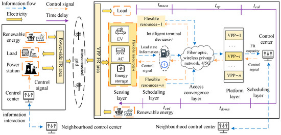- In order to reduce the computational complexity and at the same time circumvent the variability of the response of various flexible resources, the FR control architecture is constructed on the power side and the VPP side, the communication delays of the VPPs are taken into account, and the composition of each delay is introduced in a hierarchical manner.