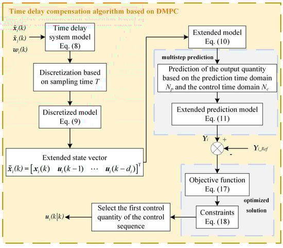 Considering the time delays associated with VPP participation in FR, the traditional DMPC approach to AFR proves to be less effective, potentially leading to the destabilization of the power system. Even when advanced techniques such as multi-step predictions and control sequence selection are employed within the MPC framework, the tolerance of AFR to time delays remains quite limited due to the cumulative truncation errors inherent in the MPC predictive process [14]. Therefore, for the dynamic model of interconnected power system and tie line power frequency presented in Section 3, there is a pressing need for time-compensating DMPC theory. This approach aims to develop a novel AFR design that can effectively accommodate the application scenarios of VPPs, which involve numerous flexible resources that experience delays in their participation in FR.